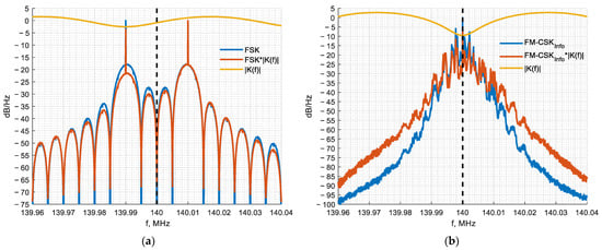 The FSK system used for the comparison has two carriers that are offset by ±100 kHz from 140 MHz. This configuration makes the FSK’s bandwidth match the FM-CSK information-carrying signal’s spectra, as seen in Figure 9a,b. The notch frequency for the FSK is set to the lower subcarrier. As in the case of 4-QAM and QCPSK, the channel depths are configured differently yet produce the same depth notch in the signals’ spectra.