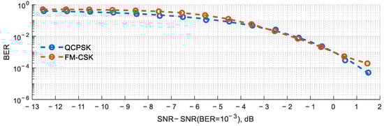 In the current study, applying attenuation to the demodulated signal controls SNR in the communication system. In the receiver, thermal noise of a constant level is added to the demodulated signal, thus allowing SNR change. The scheme provides an opportunity for sensitivity measurements, yet the SNR stays an implicit parameter. However, the research aims to determine the performance degradation in multipath fading conditions, so it is sufficient to demonstrate relative SNR change. The QCPSK and FM-CSK communication systems’ performance in the AWGN channel is presented in Figure 10. For both cases, the received signal level corresponding to BER = 10−3 is assumed to be equal to the noise level, i.e., for the AWGN channel, a normalized SNR is 0 dB for this BER level.