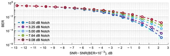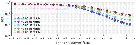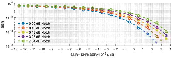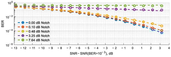 As one can see in Figure 11, Figure 12, Figure 13 and Figure 14, SNR is normalized for a 0.00 dB notch at BER = 10−3 for all studied communication systems for better side-by-side comparison. QCPSK and 4-QAM data transmission system BER performance (Figure 11 and Figure 12) for a 0.10 dB notch is 3.71 × 10−3 and 1.45 × 10−3, respectively. Increasing the notch value to 0.48 dB leads to QCPSK communication system BER performance reduction to 7.37 × 10−3, while BER performance in the 4-QAM data transmission system is 3.42 × 10−3. A further increase of the notch to 3.25 dB and 7 64 dB significantly reduces the BER performance of the 4-QAM communication system to 9.63 × 10−2 and 3.29 × 10−1, respectively. At the same notch values, QCPSK data transmission system BER performance is 1.49 × 10−2 and 2.93 × 10−2, respectively. While at lower notch values (0.10 dB and 0.48 dB) 4-QAM communication system shows better performance, at higher notch values (3.25 dB and 7.64 dB) QCPSK communication system shows significantly better performance.