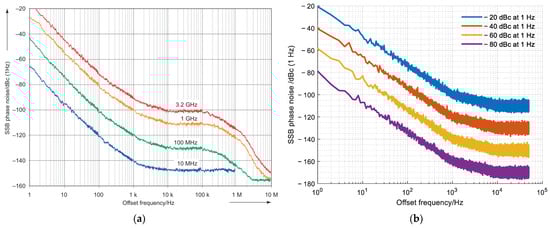 The study assumes the generation of baseband noise with a power spectral density relative to the carrier’s power (dBc), which turns to a dual sideband with the same power levels when shifted at the carrier using (3). The measured phase noise of the SMC100 signal generator using an internal oscillator from the datasheet [58] in Figure 15a is used to generate baseband noise with the power spectral density presented in Figure 15b. This approach allows adjusting the levels of the phase noise concerning the actual performance of the generator. While the curves in Figure 15b sweep across frequencies and show different power levels, the power level at 1 Hz is used to adjust the power spectral density level. The value at 1 Hz also refers to the noise curve used for the experiments.