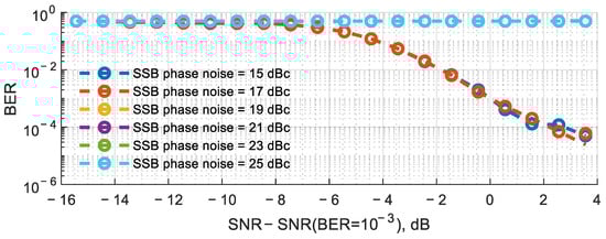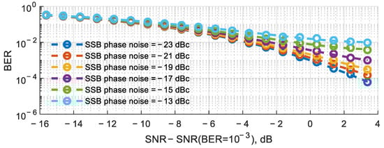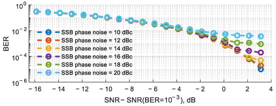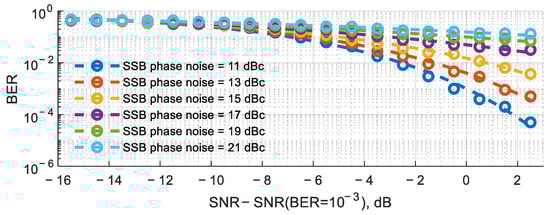 For QCPSK and 4-QAM communication systems (Figure 16 and Figure 17), SNR was normalized at BER 10−3, corresponding to a phase noise of 11 dBc for QCPSK and −23 dBc for 4-QAM. Increasing the phase noise level by 2 dBc, BER performance reduces to 3.98 × 10−3 for QCPSK and 1.48 × 10−3 for 4-QAM. If phase noise grows by an additional 2 dBc, BER performance for QCPSK and 4-QAM is 1.50 × 10−2 and 2.16 × 10−3, respectively. BER performance for the QCPSK communication system is 4.98 × 10−2, and 4-QAM performance is 3.91 × 10−3 when an additional 2 dBc of phase noise are added to the communication system. Increasing the phase noise by 2 dBc, QCPSK BER performance is 9.96 × 10−2, and 4-QAM performance is 8.20 × 10−3. If the phase noise is increased by 2 dBc, QCPSK and 4-QAM communication systems BER performance is 1.55 × 10−1 and 1.61 × 10−2, respectively.