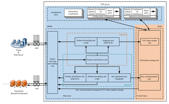 - Packet forwarding unit. This unit is responsible for forwarding UDP packets directly to the encryption-decryption node or the public network according to the transmission direction of the packets.