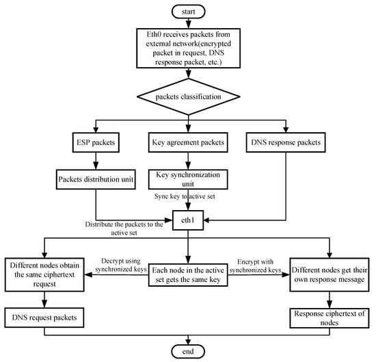 - Only when the encryption-decryption functions are normal can the node return the encrypted packets to the judgment unit. Therefore, the judgment unit maintains the status information of the nodes by counting the encrypted packets sent by the node. When the cumulative encrypted packet responses returned by a node exceed the threshold value, the node is considered normal.
