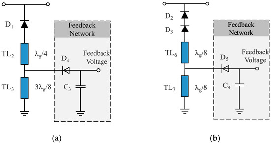 For the high-power branch (Sub-rectifier II), without feedback voltage, the diode is in reverse bias. The feedback network is disconnected from Sub-rectifier II. Thus, the length of the transmission line connected to diodes D2 and D3 is λ/4. The input impedance of TL6 and TL7 in series is a very large value. RF signal is blocked at the designed frequency. Thus, rectification is turned off. With feedback voltage, the input impedance of the feedback network is close to zero. Thus, TL7 is short-circuited and the transmission line connected to diodes D2 and D3 is λ/8 in length. The circuit is equivalent to that in Figure 2 and rectification is turned on.