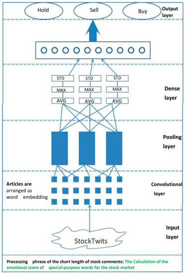 (1) In the financial word processing stage, the model uses the query interface provided by StockTwits to identify posts with a trend direction and then uses a CNN to train the financial word matrix and obtain the stock sentiment values that correspond to all words, as shown in Figure 1. Then, the IF-IDF and score values of these words are calculated in bull/bear markets.