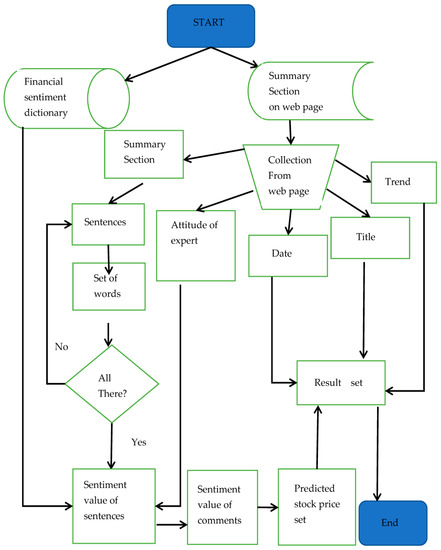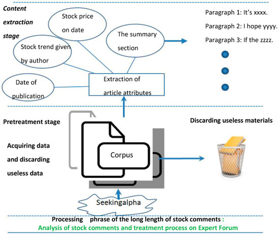 (3) In the stage of stock comment processing, as shown in Figure 2, the model uses crawler tools to obtain stock comments that contain a stock trend direction from the SeekingAlpha website and removes useless posts. Then, useful attributes are extracted from each post (including long/short ideas, the author’s view on a stock, the name of the company, the date of the issue, a summary, and the stock price of the issue). Next, the system filters the keywords of the sentence(s) in the summary and calculates the sentiment value of each sentence via the obtained sentiment list. Thus, we can judge the sentiment value of an article.