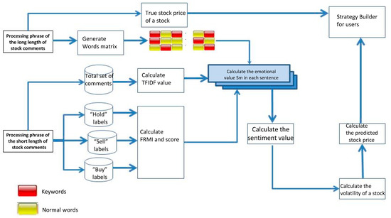 Since StockTwits mainly contains tweets with short sentences, we consider StockTwits a short-text website. As SeekingAlpha mainly contains long articles on stock comments, we define SeekingAlpha as a long-text website. When dealing with tweets, we use supervised learning. This method uses a large number of labeled samples to carefully train a model so as to improve the model’s performance. In terms of classification accuracy, this type of supervised learning is more efficient than unsupervised learning, which only uses information. Specifically, we seek to obtain the sentiment value of each word in the economic field by mining StockTwits’ short-text comments and then using them as basic elements to analyze the ready-made sentences on the long-text website SeekingAlpha to derive sentences’ sentiment value. Our system will then calculate the sentiment value of each article published by an expert. Finally, according to the sentiment value of each article, the system predicts a stock price after seven days to help investors to make decisions. Regarding our choice of long texts, we focus on the following: (1) comments on short-term rather than long-term stock trends (long-term stock trends are generally different from short-term trends)—thus, the sentiment of stock comments is not related to long-term stock trends; (2) texts containing key sentences in a summary rather than texts that lack a summary—stock reviews with key sentences more clearly reflect an author’s attitude.