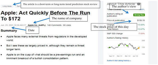 Below, we provide a screenshot of the stock comment page on SeekingAlpha. Through the forum’s search engine, we have obtained all the stock comments on the focal stocks. The key features of the dataset provided to CNN-SC are obtained through this collection process, and the stock comments of other companies are also obtained through this method. As Figure 5 shows, the crawler investigates each webpage and obtains its title, short-term/long-term stock comments, publication date, company name, the author’s attitude towards a stock when the article was published, and the sentences in the summary section.