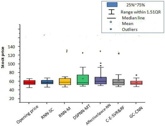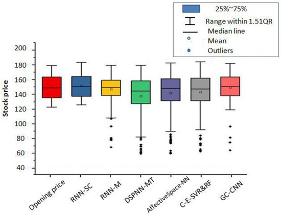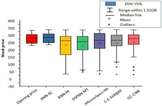 To observe the overall distribution of the predicted stock prices generated by various models and compare the distribution of multiple groups of data, we illustrate some boxplots of the results that were generated by the various models in Figure 6, Figure 7 and Figure 8. The top and bottom edges of the boxes refer to the maximum and minimum values of each dataset, respectively. The width of the box reflects the fluctuation of the data. Figure 5, Figure 6 and Figure 7 thus show that the predicted value range generated by CNN-SC can best fit the real stock value. Abnormal samples usually deviate from the normal dataset. In addition, the GC-CNN method is better than the other models, although it is not comparable to CNN-SC.