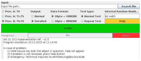 Procedure A of the BSI suite for the evaluation of randomness operates similarly to procedure B that is included in the same suite, but it is applied to the output sequences of RNGs whose purpose is to generate random numbers (not to provide bits of entropy). The same tool as that shown in Section 3.1 and Figure 1 has to be used—hence, with the same configuration options—but in this case, the tests to be selected are not T6 to T8, but test T0 and the group of tests T1 to T5. Then, the tool works as in the case of entropy assessment by loading the required samples into RAM, saving the residual samples in a dedicated file, and providing an output report both in the text box under the progress bar and as a textual file.