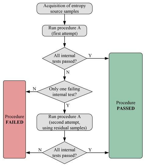 The first step (test T0) takes 3,145,728 bits as input and saves the remaining bits in a dedicated file for successive usage with tests T1 to T5. The second step takes an input of 5,160,000 bits. Similarly to procedure B, if the first attempt (Normal Test type) does not report any failing tests, the procedure can be considered completed and successful. In addition, the BSI also specifies that the confidence level of the results is , that is, the tested RNG cannot be distinguished from an ideal RNG with a confidence of . Otherwise, if only one intermediate test of the entirety of procedure A fails, the same procedure can be applied for a second and last time, but on different samples with respect to those used in the first attempt, and with the application of the same considerations for the results that were applied to those of the first run. Instead, if more than one intermediate tests fail, the procedure has to be considered failed. Based on this, a flow diagram for the randomness assessment by using procedure A of the BSI suite can be derived, and it is illustrated in Figure 5.