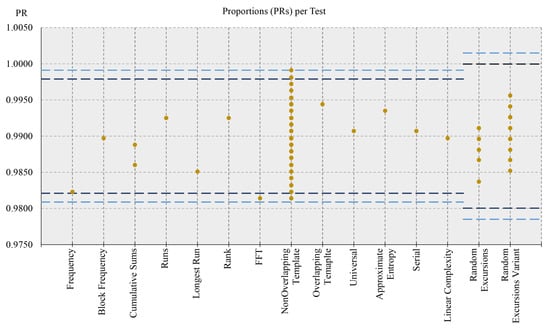 We applied the presented procedure to the DRBG implemented in [19,20] and obtained, respectively, zero and five failing tests for the PR metric when using the original NIST STS confidence interval and the more stringent one proposed by the authors of [22], as shown in Figure 7. For that graph, the former confidence interval corresponds to the widest one (dark blue dashed lines), while the latter corresponds to the narrowest one (light-blue dashed lines). In addition, for some tests, a different confidence interval is depicted. This depends on the fact that those tests (automatically) used a different number of sequences () that was derived from the specified one (k). However, the test passed in both cases, and 6 was the number of tolerated failing tests for the PRs metric when using the more stringent confidence interval. In addition, for the PoP metric, the test passed, and zero failing tests were reported, as shown in Figure 8.