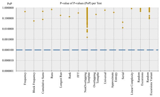 Graph of the results for the PoP metric for the tested DRBG [19,20]. The dark golden points represent the PoP values for each test, and the light-blue dashed line traces the threshold for the pass/fail criterion. The vertical axis is on a logarithmic scale.