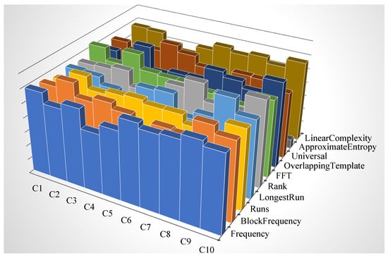 - The p-values of sequences that passed the test are distributed in the range by splitting it into 10 equal sub-intervals named C1, C2, C3, and so on, up to C10, respectively, for ranges , , , …, up to , and the uniformity of the p-values’ distribution is calculated by exploiting the chi-square (other notations of this function are chi-squared or ) function. This measure of uniformity corresponds to the PoP value.