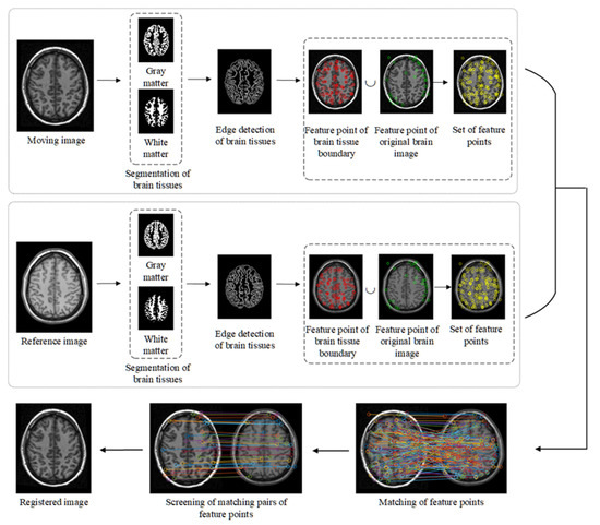To improve the brain image registration, the study proposed a new method based on different brain tissues in vivo. First, the brain tissue segmentation was carried out to obtain different tissues including the white matter, gray matter, and cerebrospinal fluid, followed by performing the morphological edge detection of different brain tissues. The key feature points were then extracted from each brain tissue and the original brain image and consisted of a set of feature points, followed by removing mismatched pairs of feature points by a random sample consensus (RANSAC) algorithm [21,22]. Finally, the registration parameters can be obtained depending on the remaining matched pairs of feature points, and be used for the final brain image registration. The registration method fully considers the morphological and spatial variability of individual brain tissues, dramatically improving the registration accuracy of brain images.
