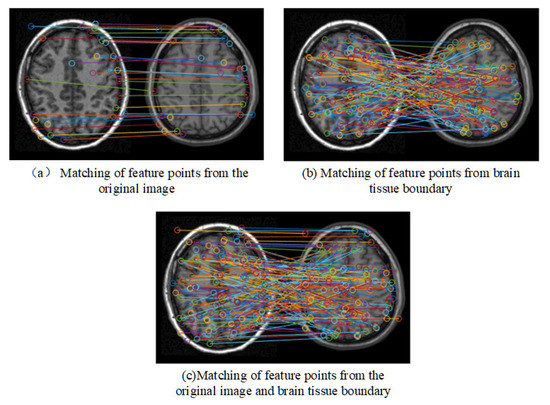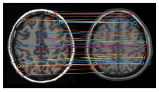 The accuracy of the matching pairs of feature points is the basis of correct registration. Therefore, the Random Sample Consensus algorithm (RANSAC) [21,22] is here used to eliminate the incorrect matching pairs based on the remaining feature points. Figure 5 shows the screening results based on Figure 4, which still includes relatively numerous feature points. The remaining points mainly exist at the brain tissue boundary, and their matching looks good for spatial location.