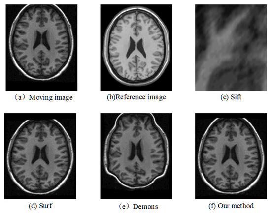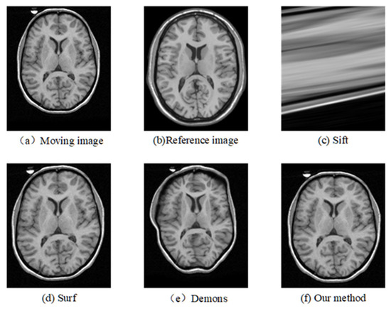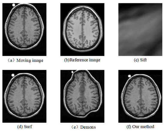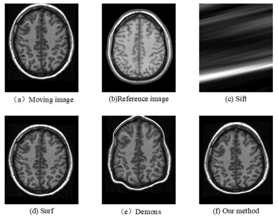 In summary, the higher the value of NCC, NMI, and MI and the smaller the value of MSD, the better the registration effect. To verify the effectiveness and accuracy of the proposed method, three algorithms commonly used for image registration are used for the comparison, including Sift algorithm [12], Surf algorithm [13], and Demons algorithm [10].