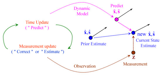 where is the state estimate matrix, is the state prediction matrix, is the estimate error covariance matrix, is prediction error covariance matrix, is KG at that time, and is identity matrix. KF time update (prediction), this system uses the previous state to predict the state of next system. The covariance matrix is used to represent the uncertainty of the estimated state at this moment, which means noise. The state transition matrix can be used to pass the uncertainty to the next moment. In addition to pass the uncertainty of the previous moment, there will also be in the prediction model. Therefore, its uncertainty at each moment in the transitive relationship needs to be modified, as shown in (13). Process model of system predicts the next state. Assuming the current system state is k, according to the process model of the system, based on the current state of the system, the next state can be estimated, as shown in (14) [10,30].