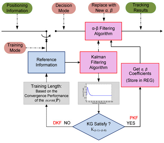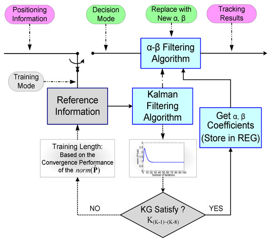 Referring to several references [17,18,19,20,21,22,23,24,25,26,27,28,29,30,31,32,33,34,35], the proposed filtering algorithm is designed. KF has very complex matrix inversion and matrix calculation, and this algorithm can greatly reduce the complexity of the calculation. A proposed tracking approach is based on the KF approach with steady state. According to the KF algorithm, the positioning algorithm often requires a large number of iterations, as shown in Equation (6). In each iteration, the calculation of KG is very large and complicated, no matter in software operations or hardware cost is a big consumption. Therefore, as shown in Figure 4, it is found that KG will stabilize after several iterations, and then replace KG in Equation (6) with α and β, K is the coefficient gain matrix with α and β and chooses DKF or PKF to become DKF and PKF filtering algorithm. From now on, iterations began to use decision mode. This algorithm can significantly reduce computing resources and processing time for chips.