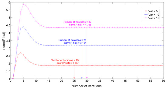 The learning curves of the Kalman gain of the stable convergence in the light of the norm of the estimation error covariance with the iteration parameter.