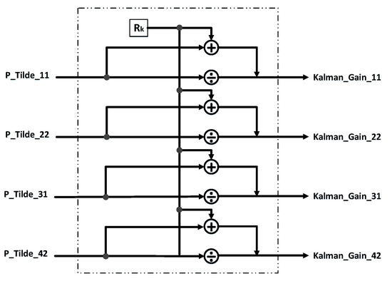 As shown in Figure 6, this module is used to calculate the weight value, which is calculated from the state noise distribution () and measurement noise (covariance R). This module involves the inverse matrix, which represents a high degree of complexity in hardware. Therefore, the inverse matrix encounters huge difficulties in this step from software to hardware, and it also has to overcome this cumbersome calculation. After the calculation of KG, the threshold will be judged by DKF or PKF. If it meets the raft value, and the α-β filtering algorithm will be started.