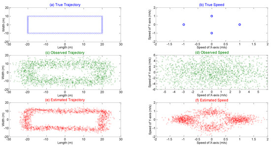 Software simulation results for the tracking location and speed of an MD based on α-β tracking approach as the MD moves the clockwise direction of the path in a plane of indoor environments (a,b) original trajectory and speed; (c,d) observed trajectory and speed (positioning approach); (e,f) estimated trajectory and speed.
