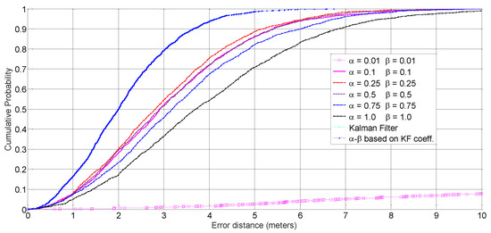 The Cumulative distribution function of the error distances, KF software-based, α-β software-based, KF VLSI-based, and proposed approach with α-β chip-based tracking approaches.
