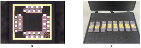 Figure 14a shows the layout plan with IC compiler. Figure 14b shows the wire bonding photo. The packing type is 32S/B. The pins are numbered counterclockwise, and Pin 1 (start counting) is indicated in Figure 14b. These are the results of using the EDA tool of TSRI on tape-out. Figure 15a,b shows the resulting display of a chip after tape-out in TSRI.