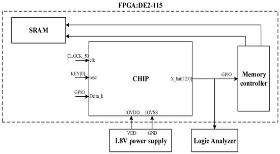 The system architecture of FPGA evaluation board DE2-115. The red frame in the Figure 15b is the system peripheral functions which will be used during chip measurement. As shown in Figure 16, the architecture of the measurement environment after the chip comes back. First, connect each pad of the chip to the corresponding GPIO pin on FPGA, as shown in Table 9. The memory controller circuit programmed by Quartus to read the SRAM control signal, is transmitted to the chip for processing. The output signal of the chip processed by the SRAM, then passed into the seven-segment display to verify whether the position of the final outputs match. The signal is also pulled to the digital logic analyzer for analysis and viewed of the wave. If the function verification is correct, forward to CIC and use the V93000, measuring machine, to measure the chip operating frequency and voltage. The chip’s pads are connected with jumper wire to the load-board of V93000. Then, set the definition of each digital pin, and connect the chip’s pads to tester channel of V93000. Set timing file and vector file for pattern. Finally, the wave is shown in Figure 17a,b.