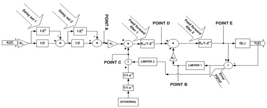 Sigma-delta modulator comprises of “sigma” and “delta” blocks [17]. The input is passed through a feed forward filter , which is a sigma block followed by a quantizer. If two feed forward filters are used in two stages, then it is called second order sigma-delta modulator [18]. Delta block subtracts output from the input [19,20]. The feed forward filter combined with delta block is termed as a loop filter [21]. The output can be generalized in Equation (1):