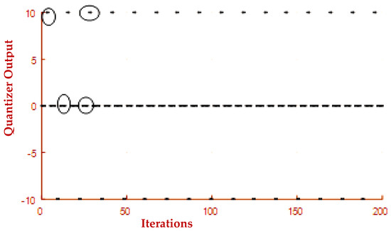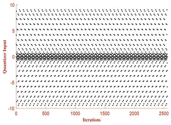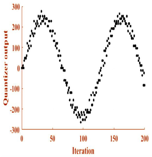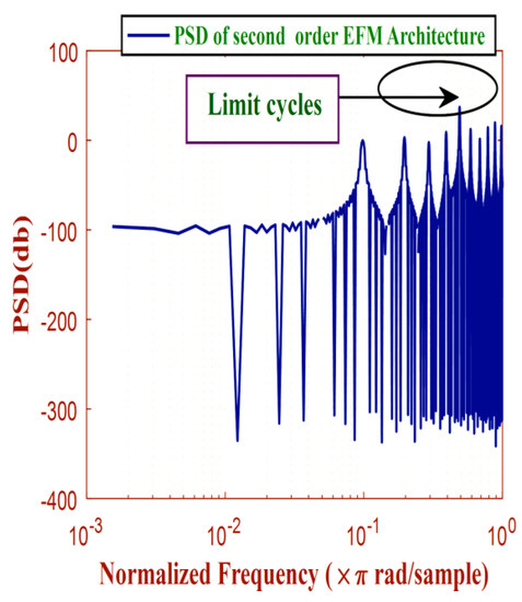 The PSD of conventional EFM is displayed in Figure 4, which shows that the quantization noise is suppressed in frequency band of interest (baseband) and transferred it to higher frequency region. However, 1-bit conventional EFM is more prone to Limit cycles, indicated in dotted ellipse portion, due to the occurrence of same bit pattern repeatedly at the output of its quantizer. The simple method to detect the limit cycle is to compare the output bit stream at each successive iterate. For some iterates “i”, the output bit stream, S(0) = S(i), then a limit cycle of some period exists. The Limit cycle is the major issue in the enhancement of performance of SDM [33,34,35,36]. For this purpose, the input and output bit stream as a function of iterate are plotted in Figure 5 and Figure 6 respectively.