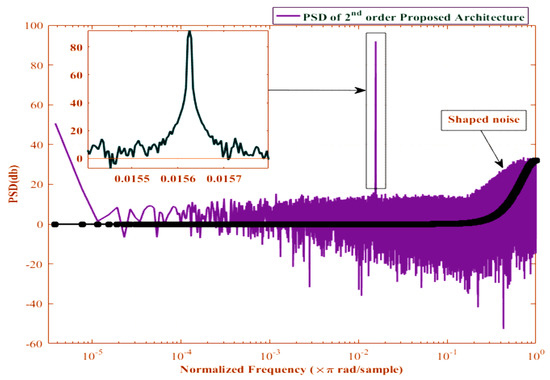 The SIMULINK model of proposed architecture is shown in Figure 7. Limiter 1 and limiter 2 prevent a proposed architecture from overflow, when high gain is applied to the proposed architecture. Figure 8 represents the PSD of the proposed architecture. The quantization noise is completely suppressed in the lower frequency region or in the DC frequency region as shown in the Figure 8. The NTF curve is plotted in black color. The NTF of proposed architecture delineates that the higher attenuation occurs at low frequency region (band of interest) and therefore the quantization noise is suppressed in this region. The Signal bandwidth is 40 KHZ and the bell-shaped curve, magnified in Figure 7, contains the useful data. Next to this frequency region, noise is transmitted due to Noise shaping. The PSD shows that quantization noise follows the NTF curve (function) of proposed architecture, which leads to the smooth spectrum. At higher frequency, limit cycles are removed due to dithering. Figure 9 also represents that the quantized output of proposed architecture does not experience the repetition of the same bits.