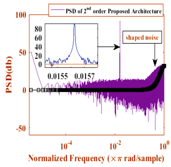 The 3rd order EFM has NTF: as discussed in Section 1. While the proposed third-order architecture achieves same NTF with its scaling factor of 4. Again, the use of limiters in the feedback path helps to obtain higher order noise shaping. Figure 10 represents the NTF graph of 2nd order EFM, 3rd order EFM and 3rd order Hybrid MASH-EFM. The black curve represents the squared magnitude of NTF of proposed architecture. While the green and blue curves represent the squared magnitude of NTF of 2nd and 3rd order EFM respectively. The NTF graph depicts that the proposed architecture will provide higher attenuation to the quantization noise in the signal bandwidth and lower attenuation at higher frequencies than the conventional 2nd order EFM architectures due to the scaling factor of NTF of Hybrid MASH-EFM. Therefore, the Hybrid MASH-EFM assists aggressive noise shaping than 2nd and 3rd order EFM. The PSD of both conventional EFM and Hybrid MASH-EFM are shown in Figure 11 and Figure 12 respectively. The PSDs of both conventional EFM and Hybrid MASH-EFM suggest that the noise shaping is more prominent in the proposed architecture.