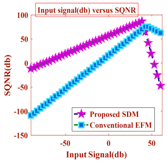 Simulation results also predict that the proposed architecture obtains higher SQNR as compared to 2nd order EFM due to aggressive noise shaping and stability as acknowledged in Table 1. The SQNR versus input signal level are also plotted for 2nd order EFM and 3rd order Hybrid MASH-EFM as displayed in Figure 15. The SQNR value in Hybrid MASH-EFM architecture reaches to 86.68 dB which is greater than EFM for the same input signal.