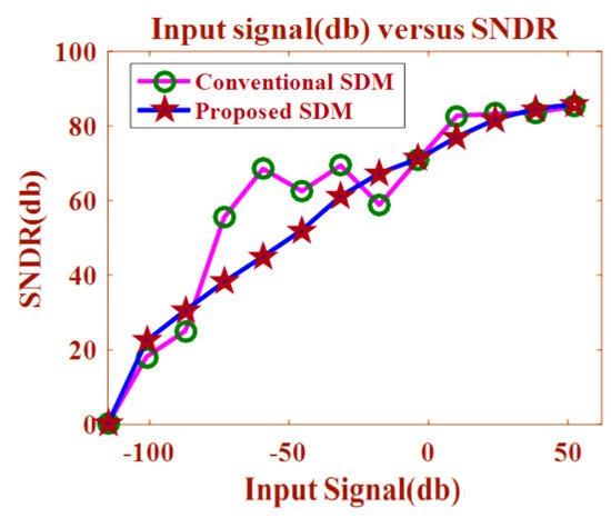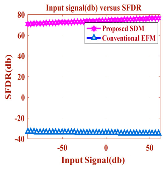 As discussed earlier, the proposed architecture effectively mitigates the problem of limit cycle which results in the improvement of spurious-free dynamic range (SFDR). SFDR is defined as the ratio of the RMS amplitude of the digital signal to the RMS value of the strongest spurious components. In Figure 16, the red and blue curves represent the SFDR of proposed and conventional architecture respectively. The peak SFDR achieved during simulation is about 76.53 dB, which is much greater than EFM. The minimum and maximum value of SFDR is 75 dB and 76.53 dB respectively, which show that the deviation of SFDR during the whole conversion process is negligible. Therefore, the next positive point in terms of its stability is that it doesn’t degrade its SFDR. While the minimum and maximum value of SFDR of existing EFM architecture is −38 dB and −36 dB, which represents the poor control over the stability issues. Also, the blue curve demonstrates that the SFDR decreases during the whole conversion process which eventually degrades its SFDR. Hence the proposed architecture provides more stability than the conventional architecture. The simulation results emphasize that it reduces spurious tones and limit cycles in its spectrum quite effectively.