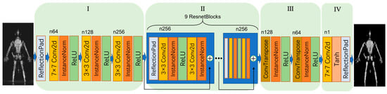 Then, we evaluate the computational complexity of the proposed method measured by the floating-point operations (FLOP) []. A single operation is referred to as one FLOP, such as one addition or one multiplication. To do so, we divide the generative architecture into four modules, as shown in Figure 3. Here we present the computational complexity of the first three remarkable network modules: convolutional layer, transpose convolutional layer and InstanceNorm. The computational complexity of the convolutional layer is calculated as: