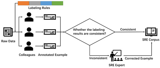 In this study, we constructed a corpus by combining experts’ experience. Multiple annotators annotated the same data. The data with the same annotation results were stored in the corpus. The annotated data for which there were inconsistent opinions were corrected by domain experts, and these modified data were then stored in the corpus. By combining the opinions of domain experts, the problems of entity classification and boundary ambiguity in the SRE domain could be solved more effectively. As Figure 2 shows, the corpus annotation and corpus quality enhancement methods were based on experts’ experience.