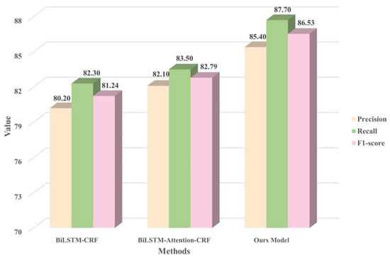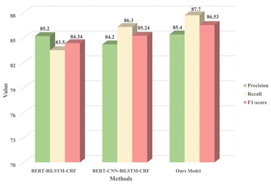As shown in Figure 5, the F1-score for the model proposed in this paper was 2.19% higher than the score for the BERT-BiLSTM-CRF model. It was 1.29% higher than that for the BERT-CNN-BiLSTM-CRF model.