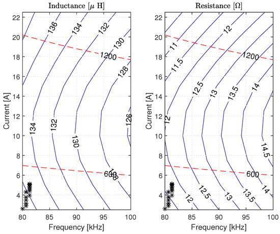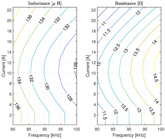 Maps or equivalent resistance and inductance for the load considered in Figure 1 in frequency–current interval of (80–100 kHz × 0.1–22.5 A) at room temperature. The data are sampled for each 2 kHz and 2.5 A, generating a 11 × 11 map. The optimal working point in the described range is found at (10 A, 100 kHz). The sweep parameter simulation was ran on a 16Gb-RAM calculator @3.4 GHz. The average analysis calculation time for each couple of parameters is 15 min.
