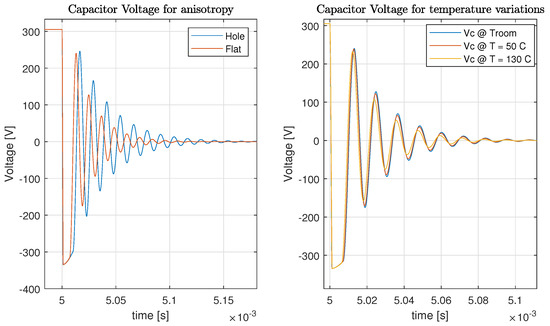 The load is characterized by its natural transient during the switching between phase I and phase II of the nominal working operation. Figure 6 represents the voltage over the capacitor for the geometry variation as anisotropy (left) and the temperature variation (right). The voltage starts from the maximum grid voltage. Then, when the IGBT is turned off, the current in the inductor flows in the capacitor, reaching the breakdown voltage of the diode. Thus, the first lower crest is damped. In the left figure, the main effect of the anisotropy sliding is the decrease in the resistance and the increase in the inductance. Lower eddy currents inside the material result in higher magnetic field energy stored in the whole domain. In the right figure, the voltage resonance is compared for different temperatures. For low-temperature variation below the Curie temperature, it has no influence on the resonant frequency and has a soft impact on the damping resistance coefficient.
