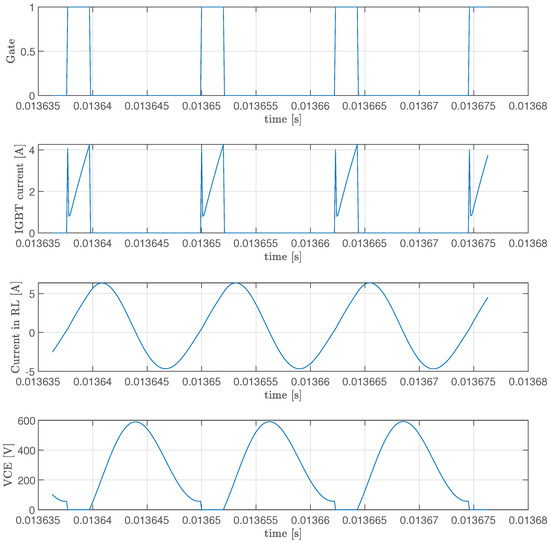 In order: IGBT gate control signal, flowing current in IGBT, current in the inductor and collector–emitter voltage drop on the IG resistance plots in the instant in which the maximum current flows in the inductor with nominal surface heating.