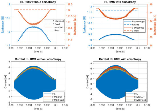 A better view of the grid carrier harmonic is represented in the bottom pictures in the Figure 8. Here is represented the comparison between the current amplitude without anisotropy and with the anisotropy. In order to follow the reference power, the maximum current must increase to compensate a lower equivalent resistance. The first two plots of Figure 8 represent the time-domain equivalent parameters output from the look-up tables for the two operative situations. Both are compared to fixed impedance values measured at low current at the operation frequency. In the Table 2, the results of time-dependent impedance are compared to results with fixed impedance. The variation of the resistance due to the grid waveform is the of the nominal value. With the introduction of the anisotropy in the heating zone the resistance drops by .