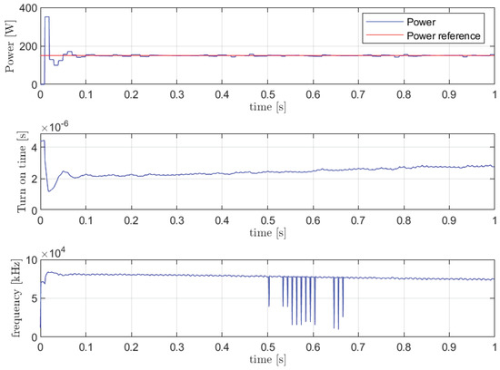 Some considerations can be drawn from a larger temporal scale: in Figure 9 the power reference and the generated power are represented in the whole simulation time. The controlled quantity, the turn-on time, is represented in the second plot. With the occurrence of the anisotropy, in order to ensure the power reference, the turn-on time is regulated to reach higher currents. Finally, the observed frequency is represented in the third plot. It falls down with the increase in the inductance, according to Equation (10).