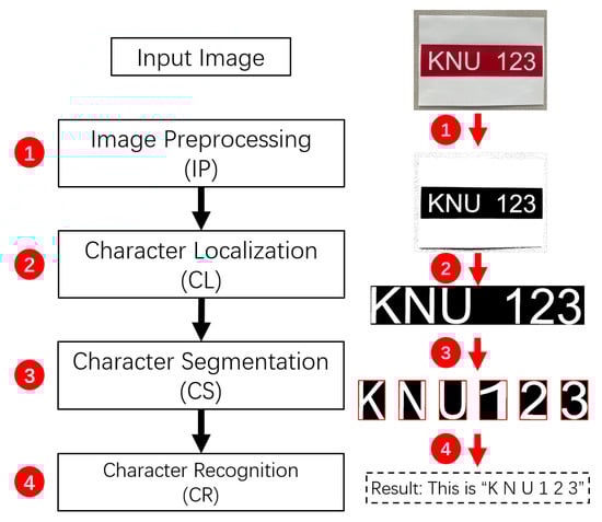 Typically, as shown in Figure 1, an OCR system consists of four main stages, which are image pre-processing (IP), character localization (CL), character segmentation (CS) and character recognition (CR). The IP stage is a pixel pre-processing of the input image, such as image graying, image filtering and image binarization, in order to reduce the image noise and enhance the effective image information. The CL stage is to find the position of the character in the image after pre-processing in the IP stage and record its coordinate information. The CS stage is to separate the characters to be recognized from the original image to form a series of single images based on the character positions detected in the CL stage. The CR stage compares the segmented image from the CS stage with the standard template image to obtain recognition results. Among the four stages of the whole OCR system, the CR stage is the most important core and is essential to the OCR system. The computation of the CR stage will most directly affect the processing results of the entire OCR system. Thus, it can be said that the previous three stages are used to provide services for the CR stage.