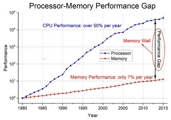 The emergence of Von Neumann has greatly contributed to the development of computer technology in human society. However, in the last few decades, processor performance has grown at a very high rate compared to memory due to the invention of the transistor and Moore’s Law. When the memory transfer speed does not keep up with the processor’s performance, it will lead to the computing power being limited as shown in Figure 3, which is known as the “Memory-Wall” problem. At the same time, as the development of the processor that relies on Moore’s Law has also gradually encountered difficulties, the development of the processor itself is also slowing down.