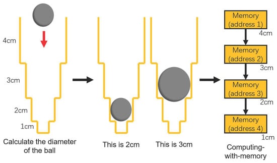 Designing the special architecture of the storage module through the result of performing pre-calculation and using it to complete the calculation gives the developer an optimization idea based on Memory-Centric Computing. As an example, for calculating the diameter of a ball, people can use a computing tool such as a high-precision ruler with their brains to do the calculation and they can soon get a more accurate result. However, to put it another way, people can also perform a storage tool-based computing method using a specific transparent container designed as shown in Figure 5 by pre-calculation. People first put the ball into the designed container and due to gravity, the ball will keep falling in the container. When the ball is stuck in a certain position, people can determine the diameter of the ball according to the position it is in.