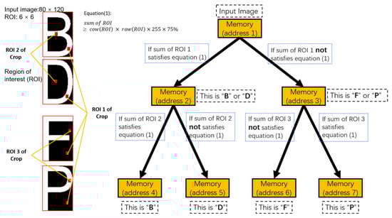 When recognizing characters in the CR stage, the input image and the standard template image first need to be resized to the same fixed size. As shown in Figure 6, when distinguishing the characters of “B, D, F and P”, “B” and “D” can be set together as a single group, since their pixels in position ROI 1 are almost the same. Similarly, “F” and “P” will also be set as the same group. When distinguishing the character of input image, the sum of pixel values at the ROI 1 position will be calculated first by using the crop and sum algorithm function in the computer vision library. When the sum of pixel values satisfies Equation (1), it will determine that the input image belongs to the group of “B and D”. Conversely, it will determine that the input image belongs to the group of “F and P”. When the input image belongs to the group “B and D”, the sum of pixel values at ROI 2 will be calculated. If Equation (1) is met, the input image is determined to be character “B”. Otherwise, the input image is character “D”. Similarly, the pixel value sum of ROI 3 is calculated and the input image is determined as character “P” when Equation (1) is satisfied; otherwise, the input image is determined as character “F”. The above is the central operating principle of the Memory-Tree algorithm.