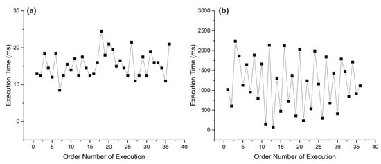 The performance of the CR stage in an OCR system has been tested after development with C/C++ and OpenCV using Memory-Tree algorithm optimization. Nearly 40 characters containing a single Arabic numeral or English capital letter were randomly tested by disrupting their order. The characters were all correctly recognized and the processing times for individual characters are shown in Figure 8a. It is worth noting that the computer hardware devices used for software implementation tests are Intel i7-4790 CPU and 16 GB RAM with Ubuntu 18.04. The power consumption and frequency of CPU are 84 W and 3.60 GHz, respectively. The character image pixel size (columns × rows) used in the development and testing of the CR stage software implementation is 80 × 120 and the ROI size of the crop is 6 × 6. This size was chosen after several practical tests. At this size, the operation of the CR stage can balance high performance and 100% recognition accuracy at the same time.