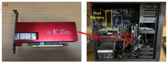 (a) Xilinx Alveo U50 Accelerator and (b) Accelerator installed in the host computer.