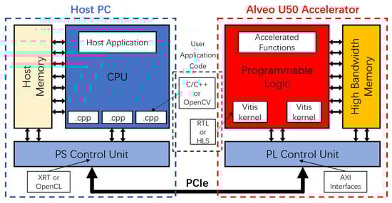 The results of the C/C++ and OpenCV software implementations show that the Memory-Tree algorithm performs better on the software side, so a hardware implementation of it will be performed. This work used the Xilinx Alveo U50 Accelerator as the hardware platform, which is a high-performance FPGA consisting of Programmable Logic (PL) with UltraScale+ architecture and 8 GB of High Bandwidth Memory (HBM) with 32 AXI interfaces. The accelerator can be connected to the x86 CPU in the host PC through the PCIe interface, constituting a heterogeneous computing in combined Processing System (PS) and Programmable Logic (PL) mode.